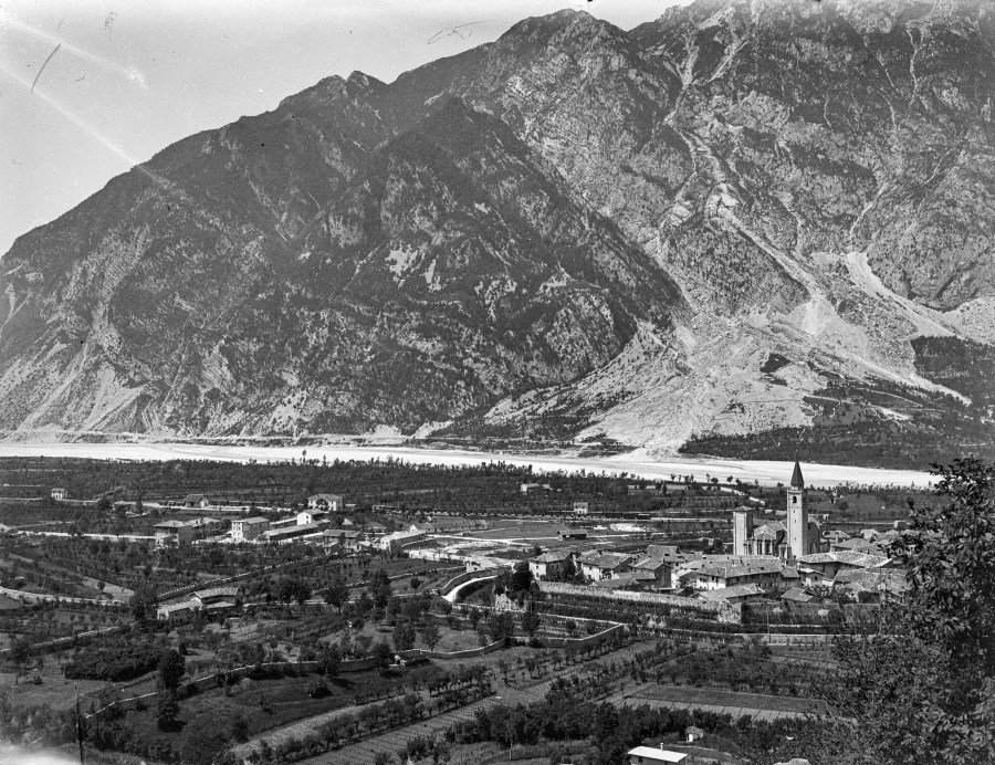 Veduta dall'alto di Venzone, del fiume Tagliamento e del Monte Simeone.
