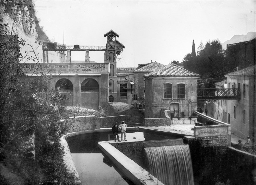 Veduta degli edifici della ditta "Società italiana dei cementi e delle calci idrauliche" ditta nata nel 1864 come Società bergamasca per la fabbricazione del cemento per opera di Giuseppe Piccinelli che sperimentò a Scanzo (ora Scanzorosciate) un sistema che permise di realizzare la calce idraulica. Questo permise all'impresa di espandersi e nei primi anni del novecento di essere acquistata dai F.lli Pesenti che fondendo questa società con la loro creeranno l'Italcementi. Nell'immagine la fabbrica e due uomini ritratti in mezzo agli edifici e al canale d'acqua.