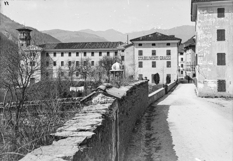 Veduta del complesso degli Stabilimenti climatici Grassi ad Arta Terme, ben identificati dall'iscrizione sul muro. Alcuni paesani sono stati immortalati dal fotografo mentre sulla parete dell'edificio a destra vi l'iscrizione con un monito per i veicoli a motore: "È VIETATO IL CORSO VELOCE DEI RUOTABILI". Gli "Stabilimenti Grassi”, costruiti nel 1870, richiamavano una clientela ricca e raffinata proveniente da tutta Italia: gli ospiti potevano godere di tutte le comodità dell’epoca, come i collegamenti giornalieri con la stazione ferroviaria della Carnia, le cure termali interne e gli intrattenimenti presso il salone delle feste e all’aperto nell’ampio parco, di cui al centro dell'immagine si può vedere il piccolo gazebo con copertura a cupoletta.
