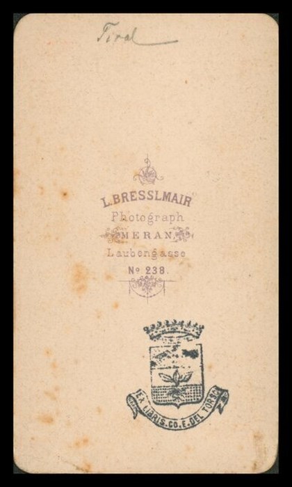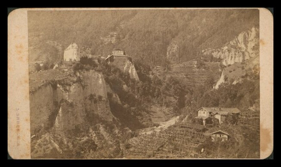 Veduta dei castelli di Merano arroccati sulle montagne, divisi da una gola tra degli edifici rurali e delle colline con filari di vigneto.