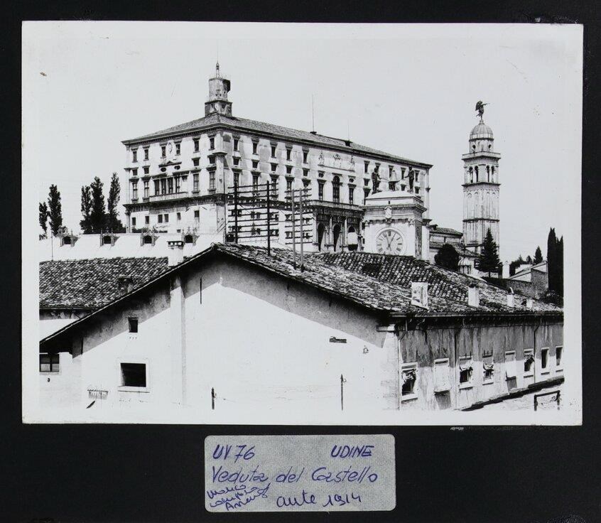 Udine: veduta di uno scorcio della città. In secondo piano, il castello e il campanile della chiesa di Santa Maria di Castello. Più in avanti, la Torre dell'Orologio, che si innesta sulla Loggia di San Giovanni, di Giovanni da Udine (1527). In cima alla Torre, i due Mori e, in mezzo a loro, una campana.