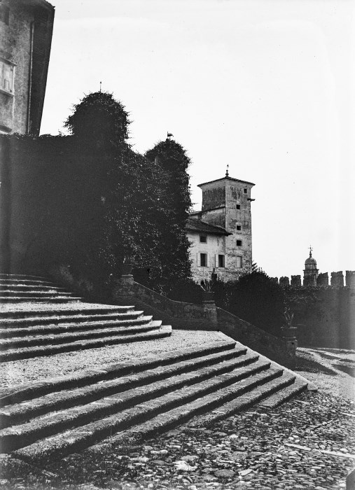 Veduta del Castello di Colloredo Mels a Monte Albano, la corte entro le mura. Fu eretto a partire dal 1302 dal Barone Guglielmo di Waldsee, Visconte di Mels; sempre più ingrandito attraverso i secoli, subì una lenta e costante sostituzione delle caratteristiche difensive con quelle più propriamente residenziali.