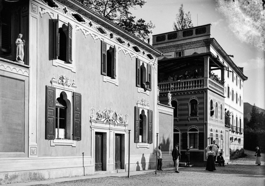 Veduta del complesso idroterapico "Vena d'Oro" a Belluno, sorto in corrispondenza di una fonte, conosciuta sin dall’epoca romana, sulla sinistra del Piave e alle pendici del Nevegal. Nella seconda metà del XIX secolo il Cav. Giovanni Maria Lucchetti vi realizzò un centro idroterapico con albergo. La prima fondazione risale al 1860 e l’inaugurazione ufficiale del complesso, con regolare assistenza medica e direzione sanitaria, avvenne nel 1869. Nei decenni seguenti raggiunse il suo massimo splendore, con la presenza di nobili e persone altolocate che giungevano da tutto il Veneto, dall’Austria, dall’Ungheria e da altre parti dell’est Europa per un periodo di vacanza e per le cure idroterapiche. Dal 1904, a seguito della morte del Cav. Lucchetti, parte della proprietà venne venduta dagli eredi e durante la Prima Guerra Mondiale il complesso fu abbandonato e la proprietà trasferita a varie società. Nell'immagine, davanti al complesso sono ritratti uomini e donne, verosimilmente nobili.