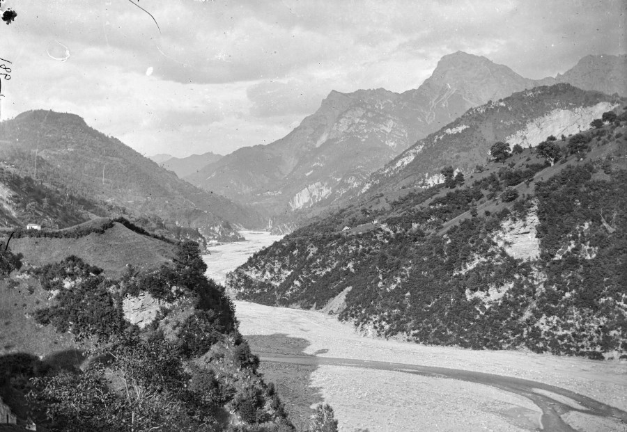 Veduta del greto di un fiume che si fa strada fra le valli di montagna.