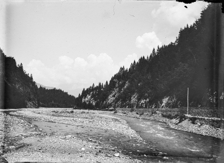Veduta del greto di un fiume della vallata che lo accoglie e del muro di cinta che costeggia la strada sul lato destro affianco alla montagna.
