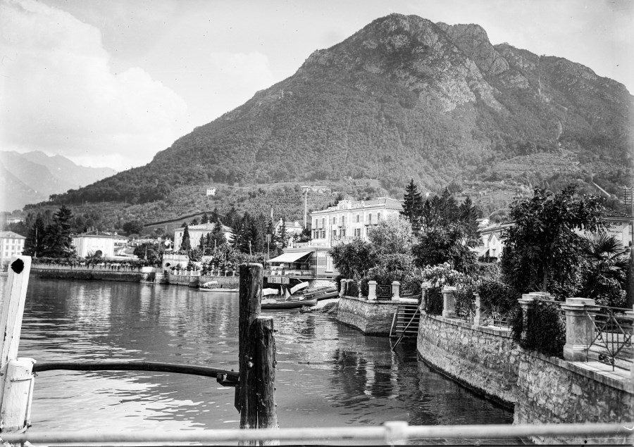 Veduta del lungo lago di Lugano con gli edifici che lo costeggiano e delle imbarcazioni ormeggiate.