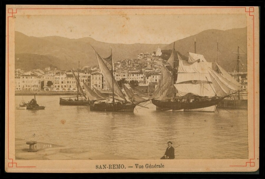 Veduta del porto di San Remo con barche a vela in navigazione; in primo piano è ritratto un uomo seduto.
