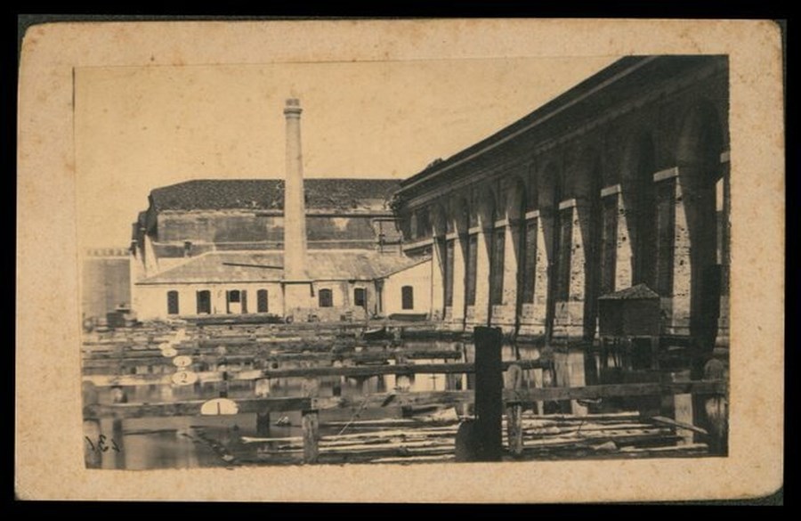 Veduta del cosiddetto "Tezon dei squadradori" nell'Arsenale di Venezia, ovvero l'edificio costruito tra 1750 e 1778 su progetto di Giuseppe Scalfarotto (Proto dell'Arsenale dal 1711 al 1754) in sostituzione di un precedente edificio in legno, nel quale lavoravano gli squadradori, ovvero gli arsenalotti specializzati nello squadro delle tavole che venivano segate dai tronchi che venivano ordinatamente accatastati e messi a stagionare, assieme alle tavole già segate a misura e pronte per l'utilizzo. Prima della parziale demolizione e rimaneggiamenti subiti nel 1880, il tezon dei squadradori, con le sue 13 arcate sul fronte ovest, costituiva sicuramente la più imponente costruzione di tutto l'Arsenale: lungo metri 147, largo metri 28, alto metri 16,80 alla gronda e metri 22 al colmo. In primo piano nell'immagine gli ormeggi segnalati da numeri progressivi.