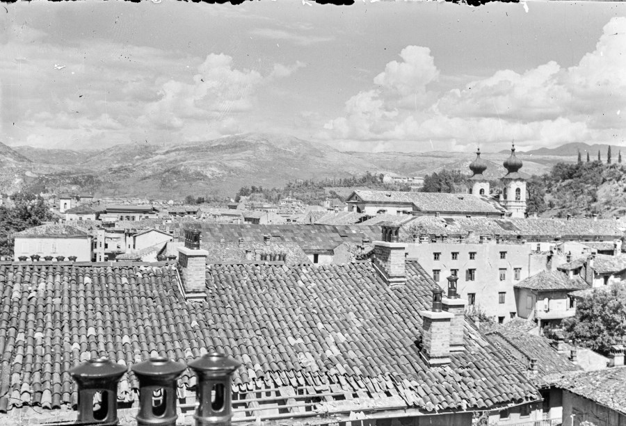 Veduta dall'alto, probabilmente da un edificio, della città di Gorizia. A destra è visibile la Chiesa di Sant'Ignazio, sullo sfondo il Monte Sabotino, teatro delle battaglie dell'Isonzo nella Prima Guerra Mondiale.