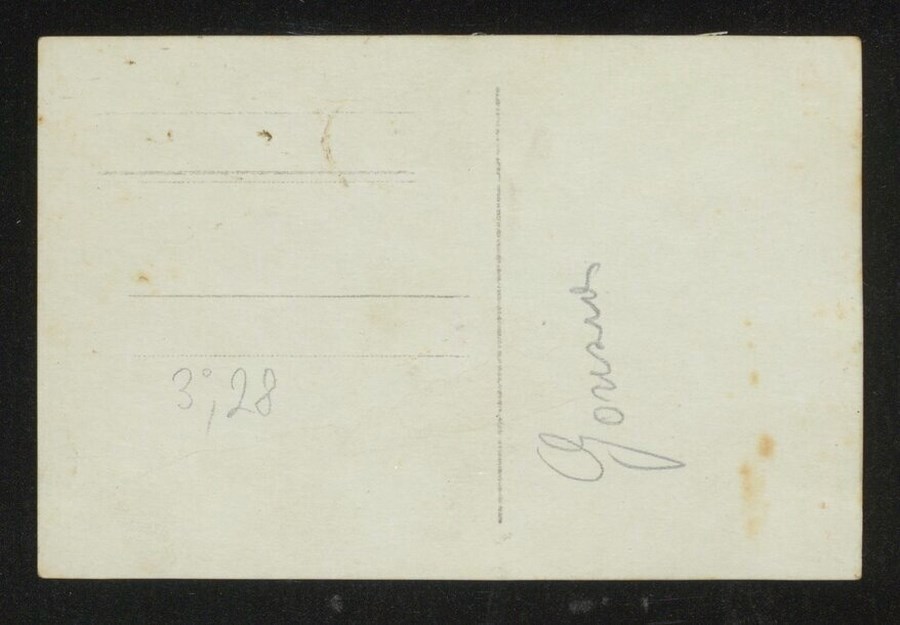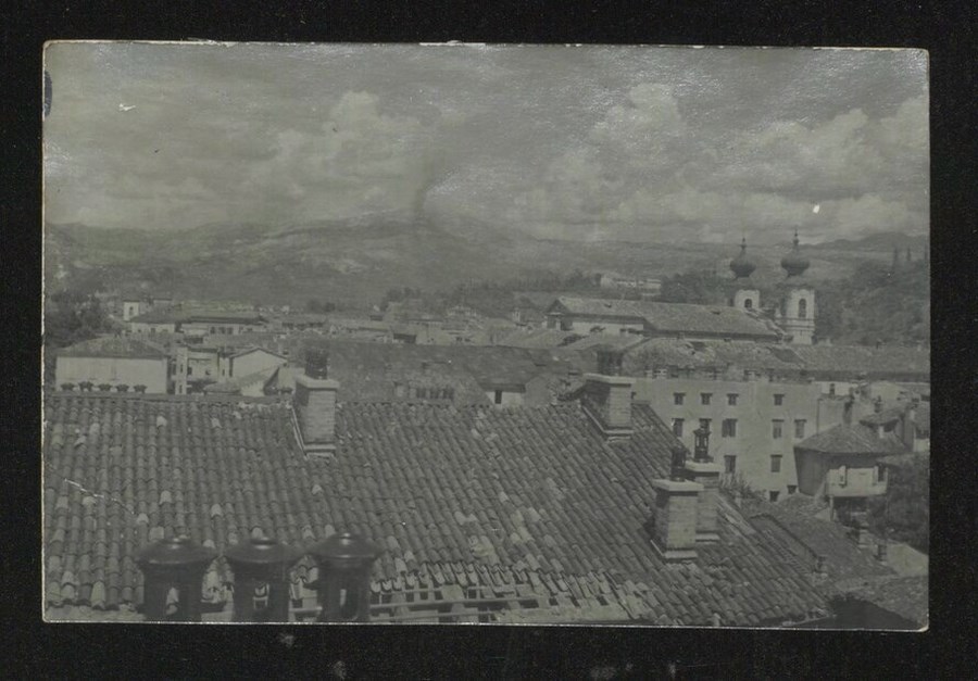 Veduta dall'alto, probabilmente da un edificio, della città di Gorizia. A destra è visibile la Chiesa di Sant'Ignazio, sullo sfondo il Monte Sabotino, teatro delle battaglie dell'Isonzo nella Prima Guerra Mondiale.
