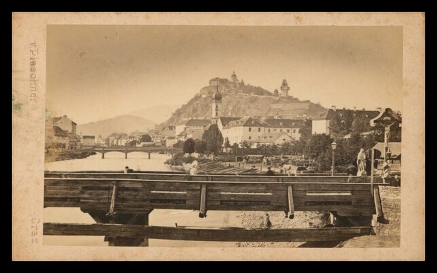 Veduta della città di Graz in Austria: alcuni ponti (in primo piano piano un ponte di legno) sul fiume Mura, sullo sfondo gli edifici e il colle con il Castello e la Torre dell'orologio.