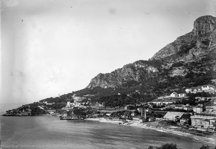 Veduta della Costa Azzurra, degli edifici e della montagna, in alto a destra, denominata "Testa di Cane" del Principato di Monaco.