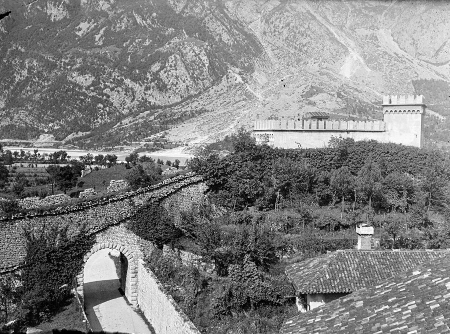 Veduta della strada che portava al castello in stile neoromanico presso la Porta di San Giovanni di Venzone; sullo sfondo il greto del fiume Tagliamento e le montagne