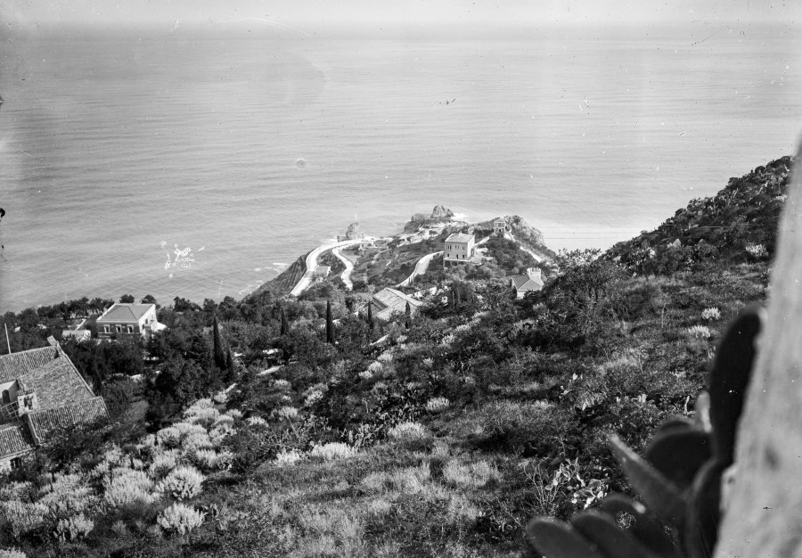 Veduta della vegetazione, delle ville e della costa di Taormina con il Mar Ionio che accompagna le veduta.