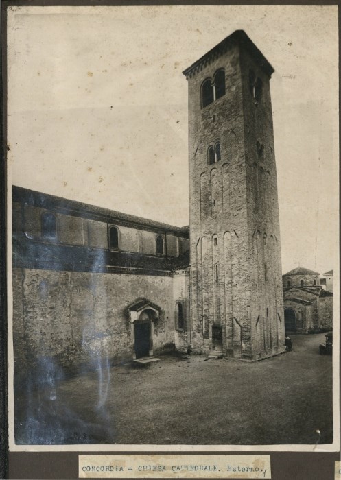 Veduta dell'esterno della Cattedrale di Santo Stefano Protomartire a Concordia Sagittaria: in particolare veduta del fianco destra posteriore dell'edificio sacro e del campanile. A destra è visibile anche il Battistero di Concordia.