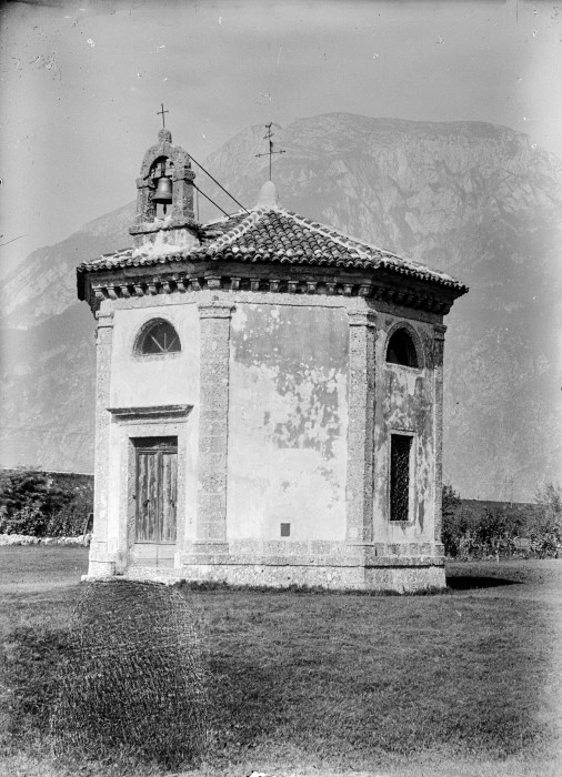 Veduta dell'esterno della Chiesa di Santa Maria del Carmelo a Venzone, con le montagne sullo sfondo. Edificio a pianta centrale ottagonale, orientato, su sedime a quota di campagna. Lungo il sottogronda corre il motivo ornamentale mensole lapidee. Prospetto principale con portale rialzato di due gradini in pietra modanata e architrave sporgente, sopra il portale d'ingresso una piccola finestra termale in conci lapidei; sopra la falda del tetto è impostata la monofora campanaria in conci lapidei.