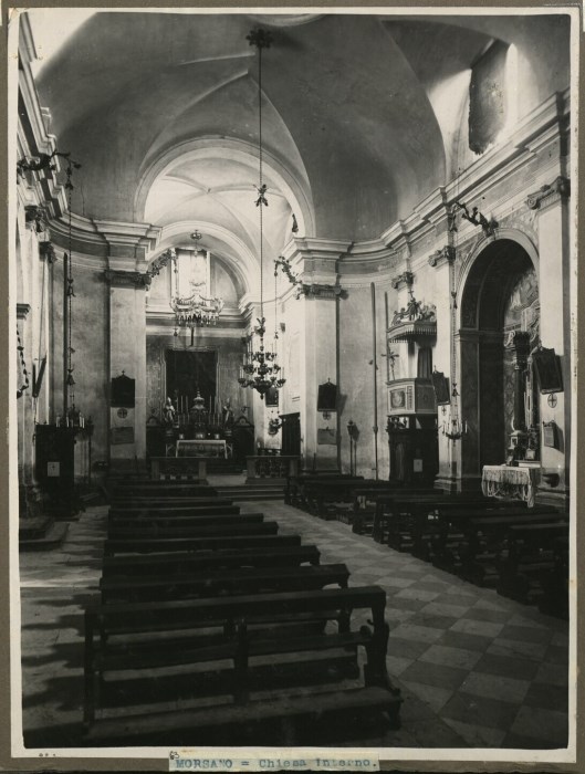 Veduta dell'interno della Chiesa di San Martino Vescovo a Morsano al Tagliamento: ad aula unica, con l'abside rialzato e preceduto da una balaustra. Nella navata a destra u pulpito e ai lati della stessa gli inginocchiatoi e due confessionali lignei.