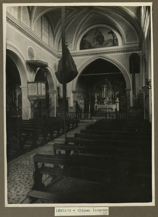 Veduta dell'interno della Chiesa di Santa Maria Assunta a Lestans di Sequals: nella navata centrale ai lati sono disposti gli inginocchiatoi; nell'immagine a sinistra un pulpito mentre in fondo, preceduto da una balaustra, l'abside con l'altare maggiore.