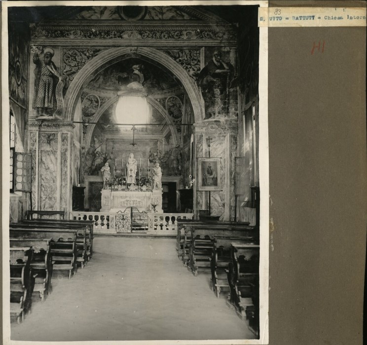 Veduta dell'interno della Chiesa di Santa Maria dei Battuti, chiesa sconsacrata, a San Vito al Tagliamento. A navata unica, l'abside è preceduto da una balaustra. Sono visibili, nell'immagine, gli affreschi dell'Amalteo e del Pordenone. Ai lati della navata gli inginocchiatoi.