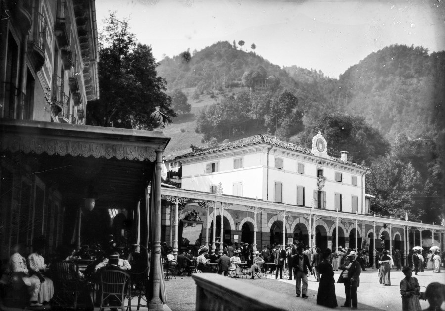 Veduta dello stabilimento di Recoaro Terme: la piazza antistante è colma di turisti che passeggiano o sono comodamente sedute ai tavoli per un momento conviviale.