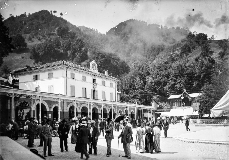 Veduta dello stabilimento di Recoaro Terme: la piazza antistante è colma di turisti che passeggiano o sono comodamente sedute ai tavoli per un momento conviviale.
