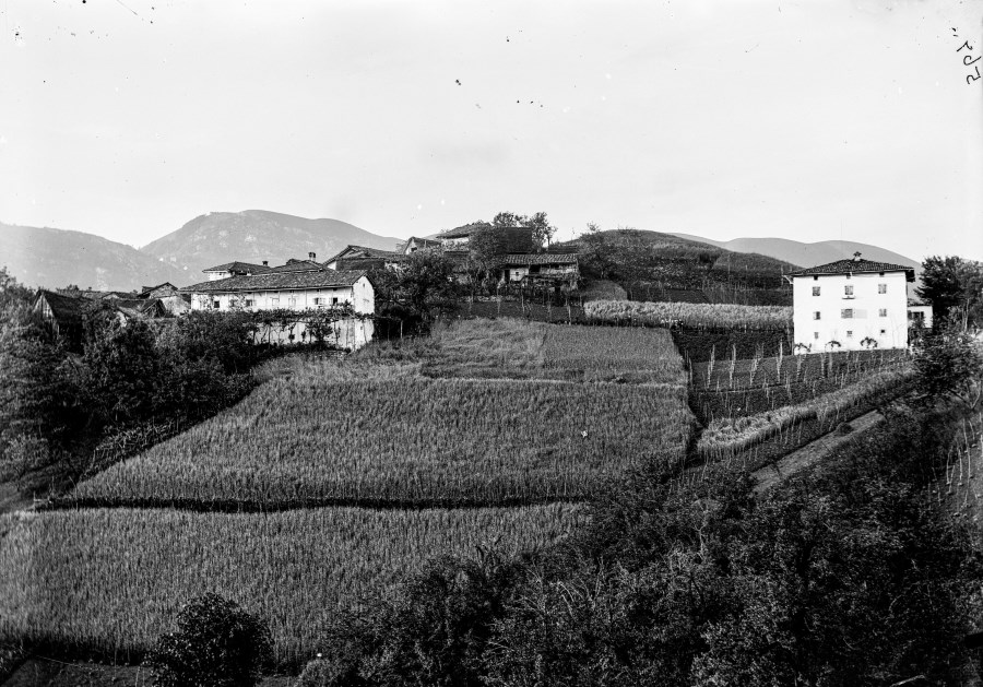 Veduta di campagna: alcune abitazioni rurali dislocate su una collina coltivata con vigna e campi di mais.