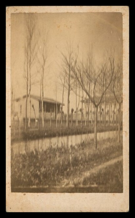 Veduta di campagna: il passaggio di un canale affianco ad un filare di alberi e sullo sfondo delle case rurali.