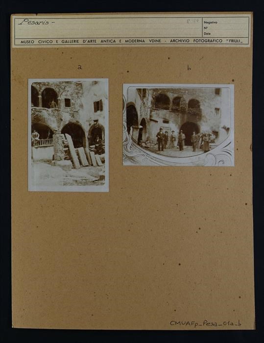 Prato Carnico, Pesariis: case carniche probabilmente del Seicento con portico, solai e loggiato. Si vedono alcuni abitanti in posa, tre nella fotografia "a" e sei nella fotografia "b".