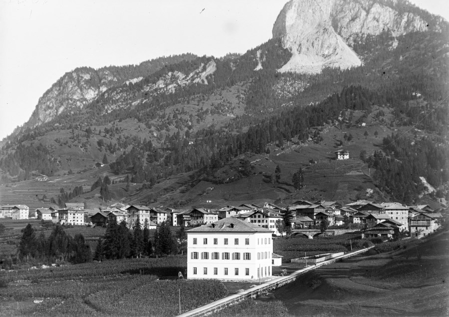 Veduta di Forni di Sopra, con in primo piano l'edificio della Scuola Comunale, alle spalle della quale si intravede la sporgenza di una cappella della Chiesa della Salute, e sullo sfondo, il Clap Varmost.