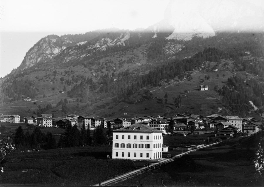 Veduta di Forni di Sopra, con in primo piano l'edificio della Scuola Comunale, alle spalle della quale si intravede la sporgenza di una cappella della Chiesa della Salute, e sullo sfondo, il Clap Varmost.