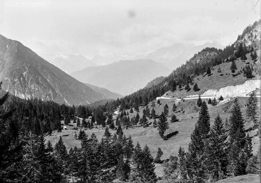 Veduta di montagna dove, tra il bosco, spunta qualche stavolo; in alto a destra una strada sterrata.