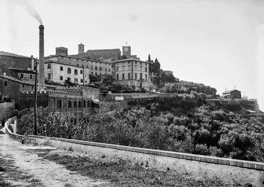 Veduta di Montecatini Alto anticamente chiamato Montecatini Val di Nievole. Nell'immagine in alto il Castello di Montecatini e la Chiesa di San Pietro Apostolo; famosa già in epoca romana per le terme a sinistra un comignolo alto probabilmente utilizzato per riscaldare le acque.