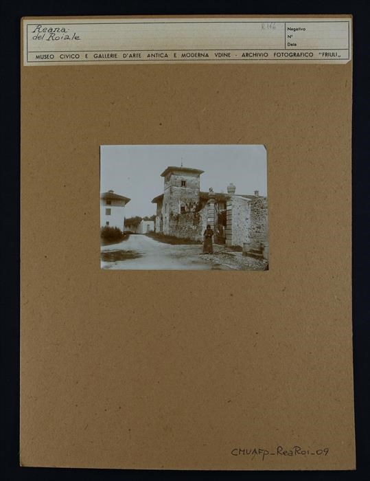 Reana del Roiale: veduta delle vecchie mura e di residenze, di cui una dotata di cancello, a destra. Quasi di fronte ad esso, una ragazza in abiti umili con l'attrezzo da lavoro.
