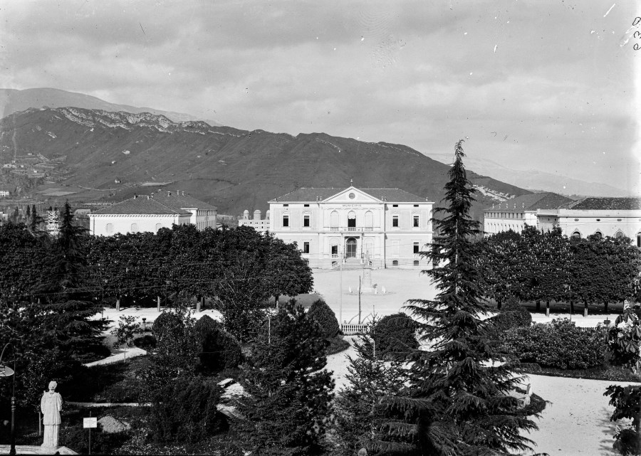 Veduta di Piazza del Popolo a Vittorio Veneto. Realizzata su disegni dell'arch. Giuseppe de Min venne originariamente denominata piazza Vittorio Emanuele II e, durante l'ultimo conflitto, Piazza del Popolo. E' un insieme armonico di edifici di stile umbertino, in uno scenario quanto mai suggestivo creato dai giardini pubblici, oltre i quali s'innalza l'imponente mole rocciosa del Monte Altare. Nel centro della piazza il monumento a Vittorio Emanuele II, ora non più visibile. La piazza è chiusa a levante dal Palazzo Comunale, eretto nel 1872, su progetto dell'ing. Federico Gabelli.