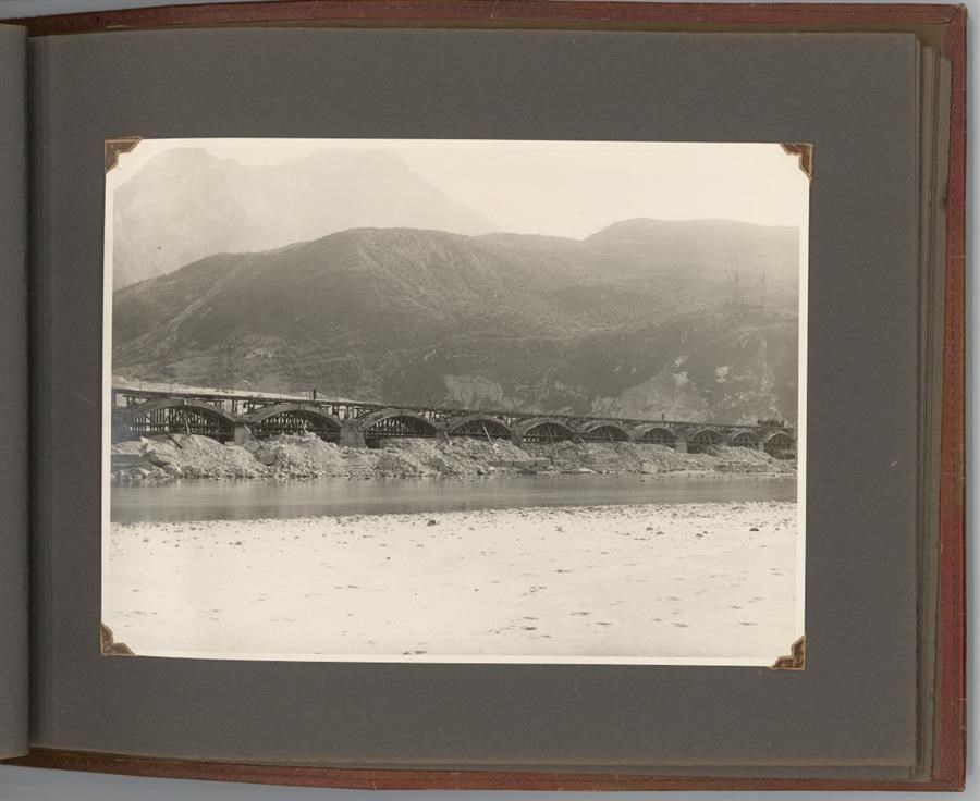 Veduta del cantiere di ricostruzione del ponte viadotto della Ferrovia Pontebbana sui Rivoli Bianchi, sul fiume Tagliamento, tra Gemona del Friuli e Venzone, danneggiato dai bombardamenti alleati durante la Seconda Guerra Mondiale. Si vede il greto del Tagliamento e impalcature lignee per la ricostruzione delle arcate del viadotto. Il ponte, posizionato nel secondo tronco della linea ferroviaria che collegava Udine a Pontebba (dove fino alla fine della Prima Guerra Mondiale si collocava il confine austroungarico) ed il cui tracciato completo venne inaugurato il 30 ottobre 1879, era formato da 33 archi, per una lunghezza di 783 metri. Danneggiato durante la Seconda Guerra Mondiale, venne ricostruito nel 1946 dall'Impresa ing. Ugo Fiaccadori (Milano-Udine) che documentò i lavori con l'album fotografico cui questa immagine appartiene.