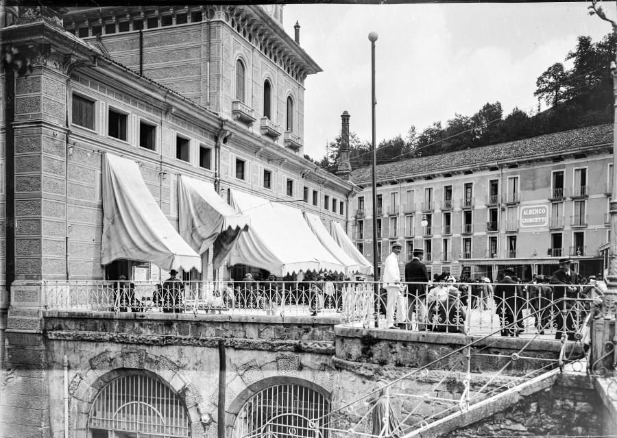 Veduta della terrazza di un edificio nel centro di Recoaro Terme: persone in abiti dell'epoca passeggiano e sono sedute ai tavoli; sullo sfondo l'Albergo Giorgetti.