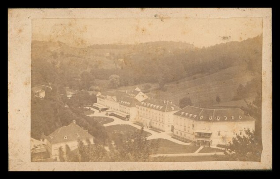 Veduta panoramica di Rogaška Slatina (in tedesco Rohitsch-Sauerbrunn), sede termale e famosa località turistica sin dall'inizio del XIX secolo. Si identifica nell'edificio a destra, lo Strossmayerev Dom.
