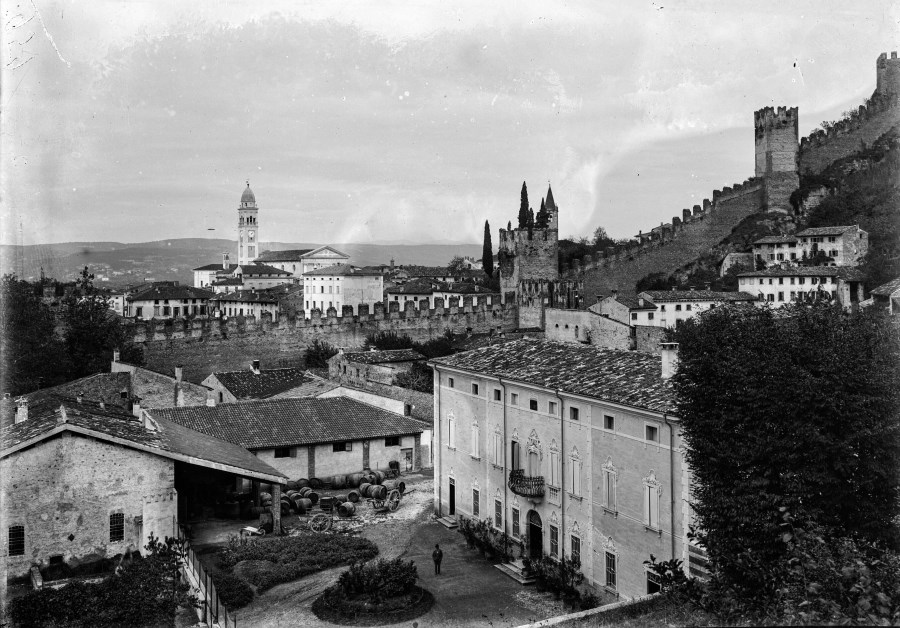Veduta di Soave, delle mura di cinta del Castello Scaligero, della Chiesa di San Lorenzo e del campanile. In primo piano degli edifici che affiancano le mura ed un cortile dove sono stoccate delle botti; su uno dei due calessi sono adagiate delle botti. Al centro del giardino un curioso signore viene immortalato dal fotografo.
