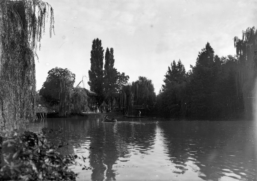 Veduta di un lago all'interno di un parco; due piccole barche trasportano dei turisti ed alcune persone passeggiano nel parco colmo di vegetazione.