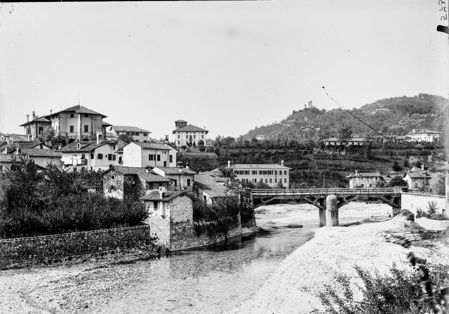 Veduta fluviale con ponte in legno, delle abitazioni e delle ville sulle colline,