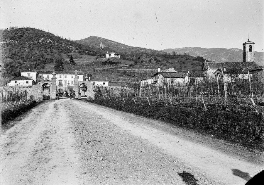 Veduta di un paese con mura di cinta: in primo piano la strada sterrata che conduce all'ingresso del paese dove, ritratti, ci sono alcuni paesani in posa. Dietro a loro il cancello di ingresso ad una villa; a destra la chiesa, il campanile ed altre abitazioni. Sullo sfondo alcune colline con una chiesette e, più in alto, i ruderi di un castello.
