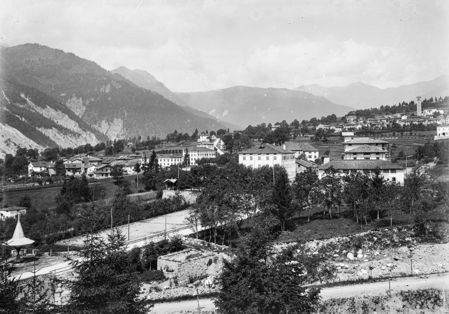 Veduta di un paese di montagna, a sinistra una piazza una struttura con copertura simil piramidale, a destra il paese con la chiesa e le montagne sullo sfondo.