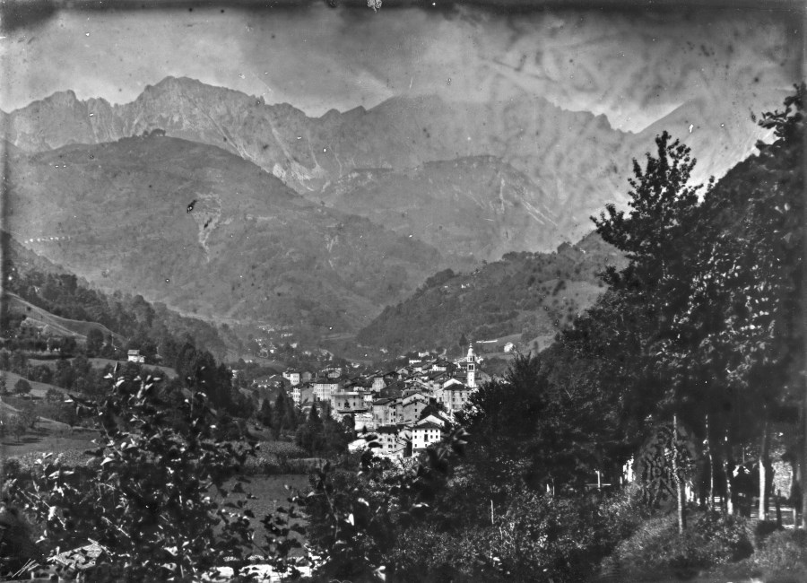 Veduta di un paese incastonato tra le valli di montagna.