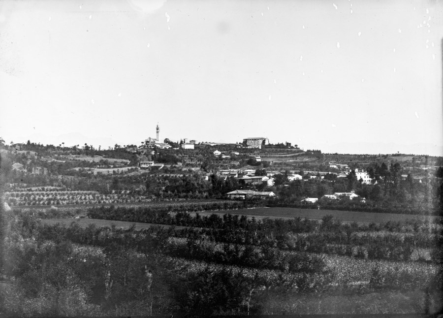 Veduta di un paese situato sopra una collina dove è particolarmente visibile la chiesa con il campanile ed un grande edificio. Tutt'attorno campi coltivati e vigneti.