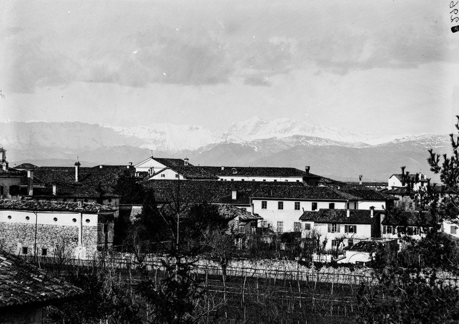 Abitazioni rurali e ville con muro di cinta, le montagne innevate si stagliano sullo sfondo.