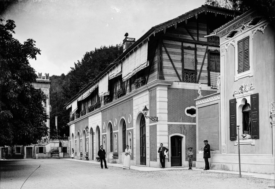 Veduta di un palazzo dove la parte superiore è costruita in legno e coperta da tendaggi. Sulla piazzola sterrata sono ritratti dei nobili.