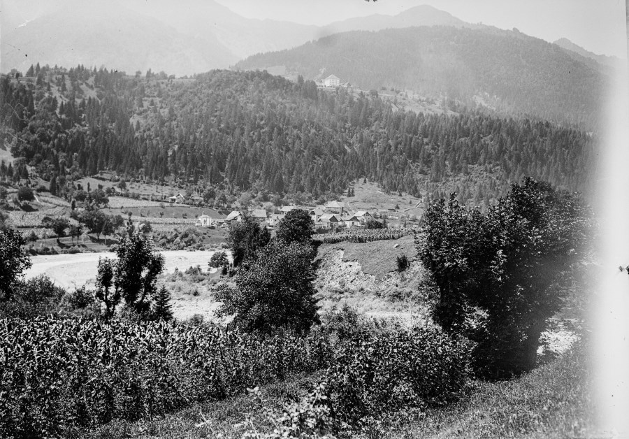 Veduta di un piccolo paese di montagna situato accanto al greto di un torrente.