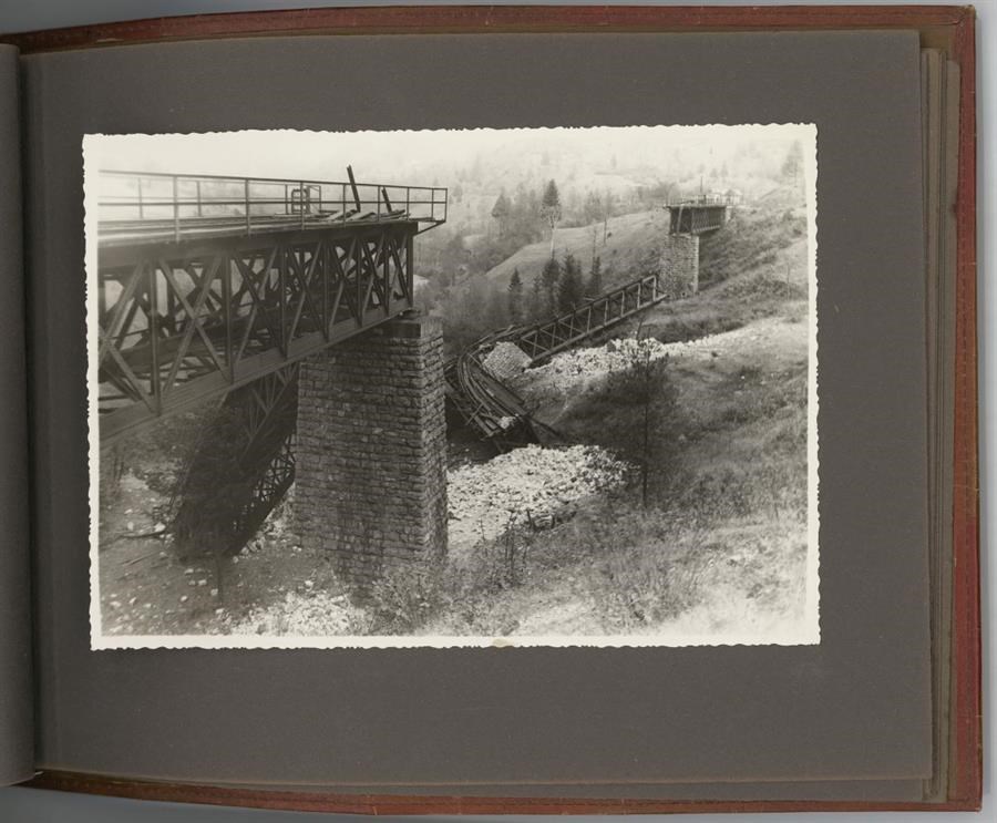 Veduta di un ponte ferroviario in ferro, verosimilmente della linea ferroviaria Pontebbana, caduto. Il ponte si ergeva su un declivio montano: in primo piano si vede un pilone integro mentre dei successivi due piloni si vedono a terra le macerie, come sempre a terra si vedono le campate metalliche e i binari. La fotografia è inserita, sciolta, alla fine dell'album "Linea Udine-Tarvisio. Ricostruzione viadotto sui Rivoli Bianchi. 6 febbraio 1946. Impresa Ing. Ugo Fiaccadori, Milano-Udine".