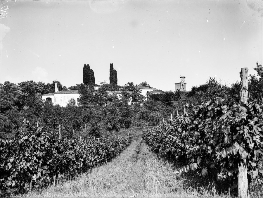 Veduta di un vigneto che, in stile prospettico, conduce, tra la vegetazione, ad una chiesetta a sinistra, alcuni edifici ed una torre con orologio a destra.