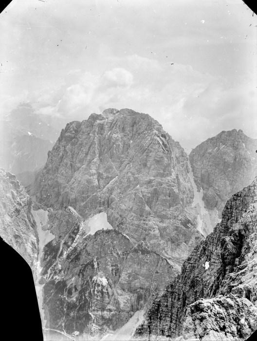 Veduta di una cima rocciosa parzialmente innevata delle Alpi Giulie